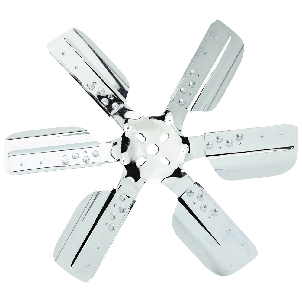 This 18" heavy duty reverse rotation fan features beautifully polished and chrome plated steel hubs and 6 polished stainless reinforced blades with a large surface area that improve performance and fuel economy and is rated up to 10,000 RPM. The large surface area of the blades pull more air at lower speeds than other flex fans.
