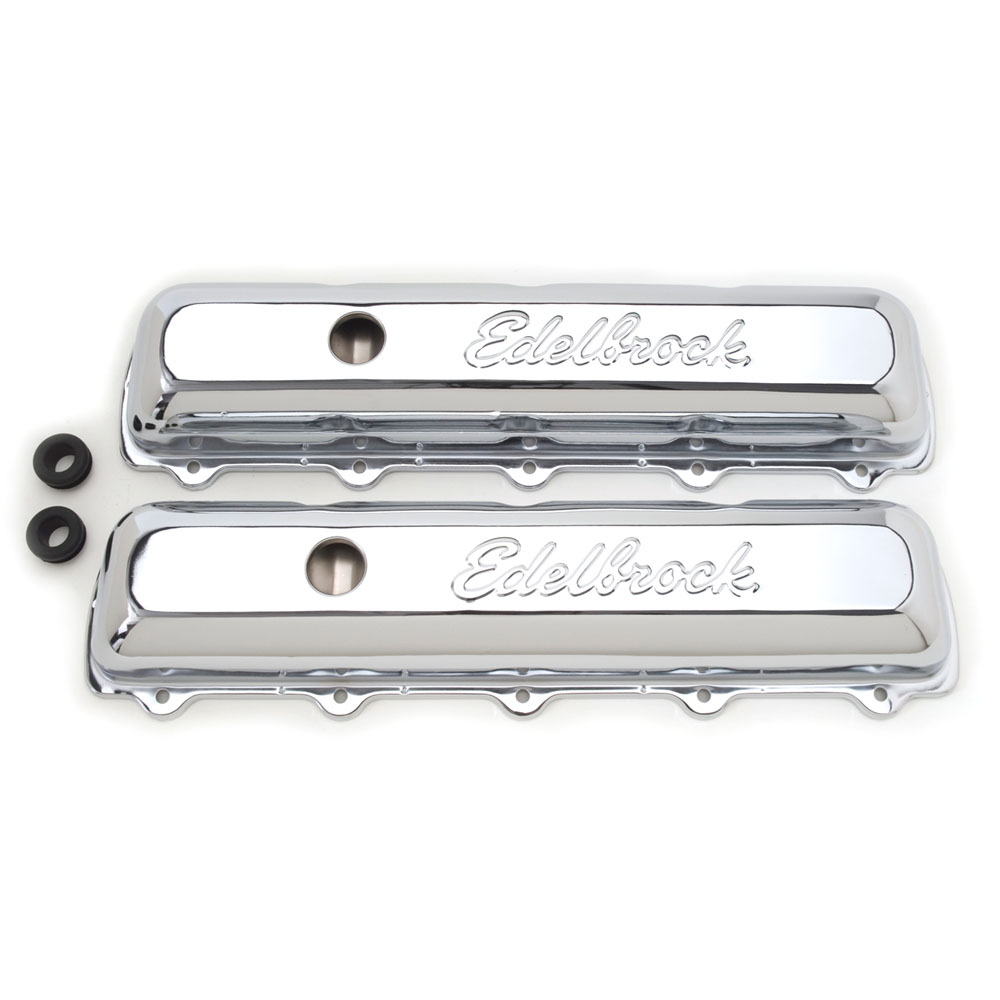 Edelbrock Valve Covers 4485; Signature Series Chrome Steel for Oldsmobile 350 to 455 with 5 and 10-hole Heads