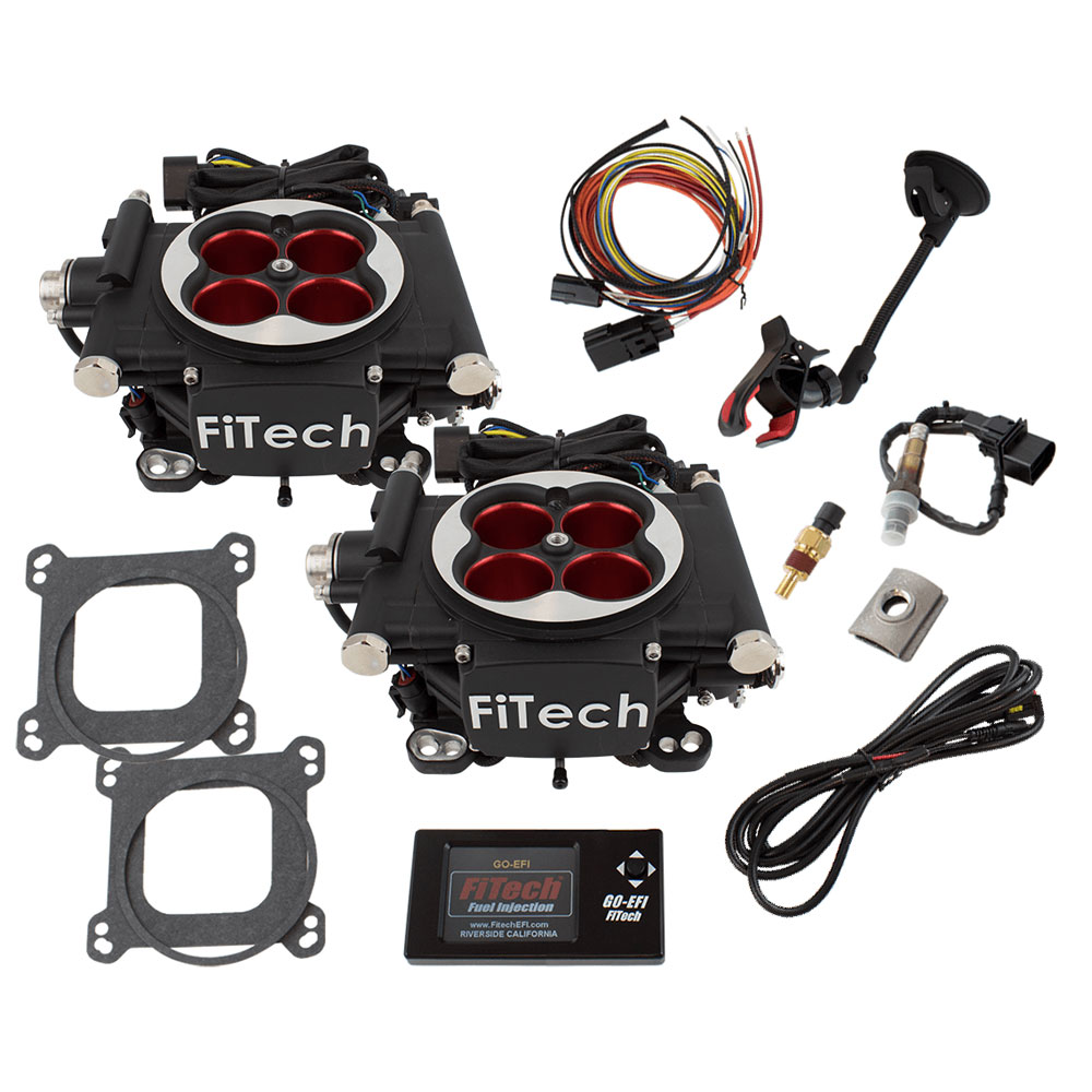 This Kit is for the guys who have 671 and 871 Roots Superchargers or make up to 1200 HP naturally aspirated on their Dual Quad setup. FiTech EFI Has made it simple with their Go EFI 2X4 POWER ADDER 1200HP self-tuning System. Works out of the box on your 2X4 Blower Plate as an inline setup or can be side mounted using custom linkages. ALSO, this kit is a bolt on for the most popular N/A dual quad and tunnel ram manifolds including the Edelbrock line of dual quad manifolds WITHOUT any adapters! They fit and look like they belong there because they were designed to fit from the start. One Throttle Body handles all of the brains while the second holds 4 additional injectors plus the IAC motor for idle stability. These can also be used in cross ram and tunnel ram configurations. This kit does not include linkage or fuel lines Boost A/F targets are simple to adjust while timing curves can be retarded according to boost easily through your touch screen controller. This system makes tuning your Supercharged engine easy! Bolt on 2 of these tough looking throttle bodies and drive your car as the system dials itself into the perfect calibration for all of your driving and weather conditions. If you decide you want to tune for more power or economy, the FiTech Touch Screen controller allows quick and easy On The Fly adjustments at your fingertips! Note that this 30064 Go EFI 2x4 1200 HP/Power Adder is only available in Matte Black finish.
