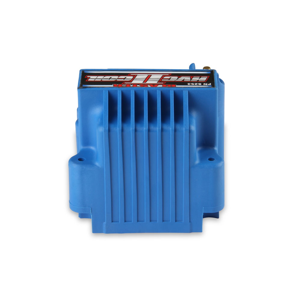 The latest coil to be built entirely in-house at MSD is designed to be used with MSD 6 and SCI Series ignition Controls. This coil utilizes an iron u-core design with a segmented bobbin for improved voltage distribution. The bobbin is molded from a special DuPont rynite material and wound specifically to produce the most current possible with incredible voltage and lightning quick rise time. The blue housing is also molded from high dielectric rynite material. The brass primary terminals are spaced far apart and the secondary tower is well protected for increased spark isolation. The housing is completely coated with an epoxy compound for vibration resistance and installs with sturdy vibration mounts.