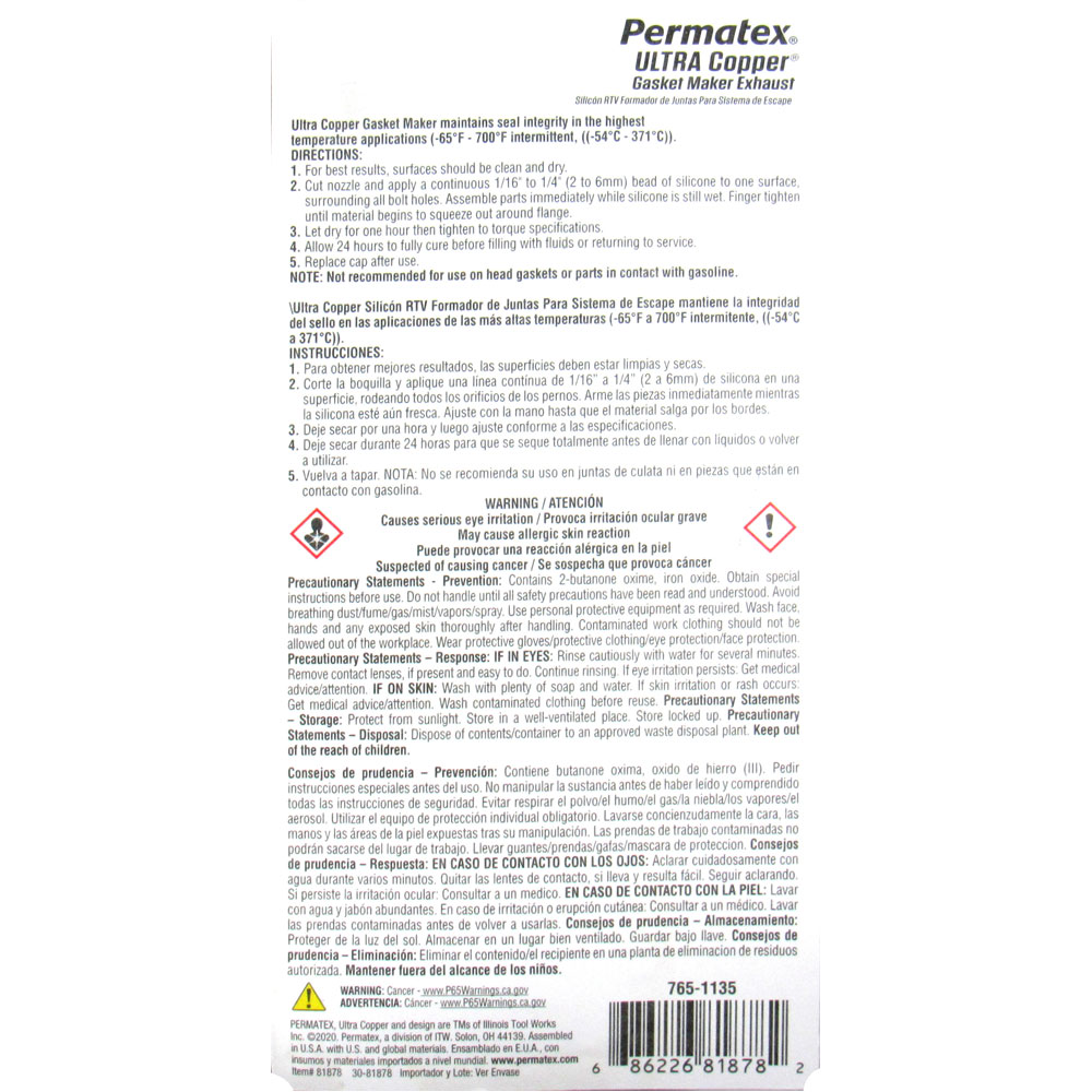 Permatex Gasket Sealant 81878; Ultra Copper Maximum Temperature RTV 3.0 oz. Squeeze Tube Copper Silicone