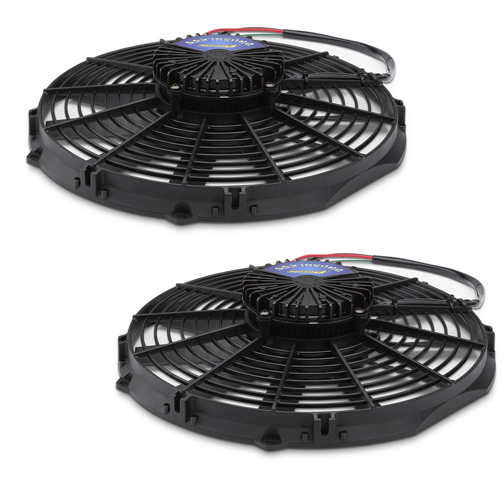 2 Pack of 12" Brushless Fans, 67034 x2. PROFORM's new brushless motor electric cooling fans deliver more CFM than than the competition for MAXIMUM COOLING. These Brushless fans are lightweight, low-profile, no amp spikes, and create cooling unlike anything out there. The best part is, it's totally universal and designed for 12 volt Systems Not fancy engine specific controller required, just wire up the (+) and (-), and you're ready to good. Soft start ramp up prevents amp spikes. This is strictly a puller fan and is not reversible. Prevent overheating in stop-and-go traffic, designed to fit the most popular cars and trucks, frees the water pump pulley for more RPM, installs in minutes with simple hand tools. Thin design to fit cramped locations. Reinforced glass filled polypropylene blade and plastic housing for minimized weight. Nylon tie mounting kit included.